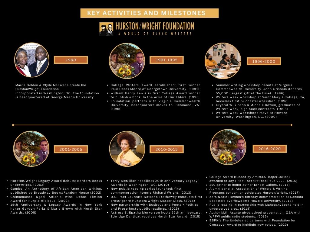 Initial seed money of $750 came from Marita’s own funds. George Mason University in Northern Virginia, where Marita was a professor, helped to establish Hurston/Wright as a nonprofit organization. On August 22, 1990, the Zora Neale Hurston/Richard Wright Foundation was incorporated in Washington, D.C., Marita’s and Clyde’s hometown.